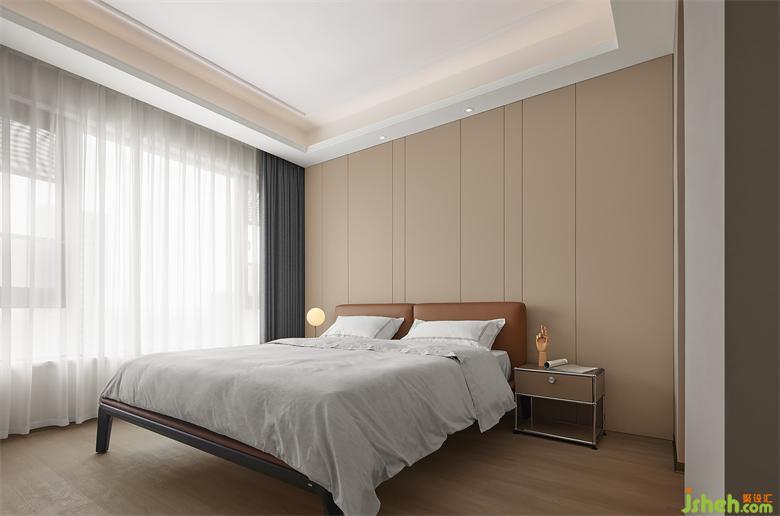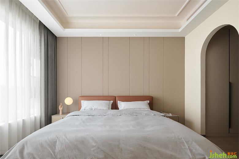 主臥以暖色為基調(diào),硬包床頭背景墻和焦糖色床體相互映襯,豐盈著空間色彩層次,家裝設(shè)計(jì)營(yíng)造出柔和舒緩的休憩環(huán)境。