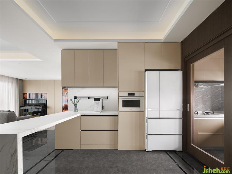 開放的西廚區(qū)域與餐廳相對(duì),同時(shí)與右側(cè)中廚連接,家裝設(shè)計(jì)形成流暢的洄游動(dòng)線。中西廚俱全的布局,能夠滿足業(yè)主日常制作美食的需求。