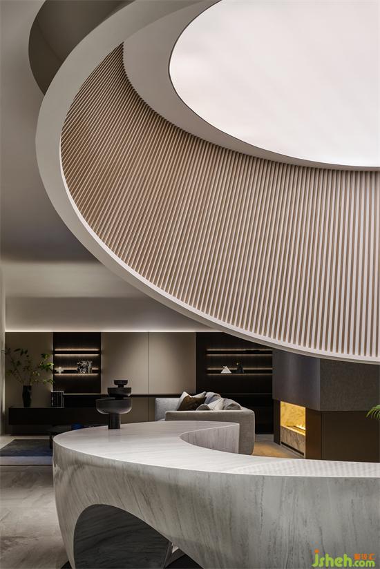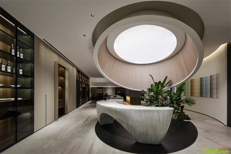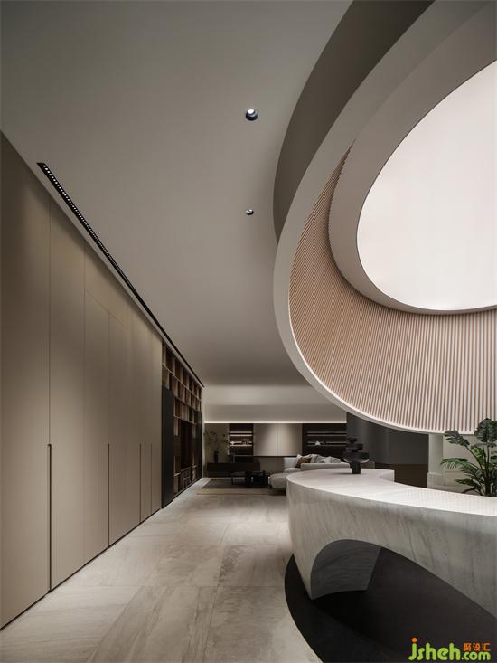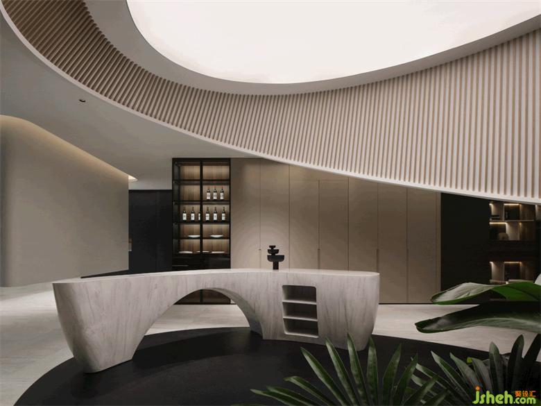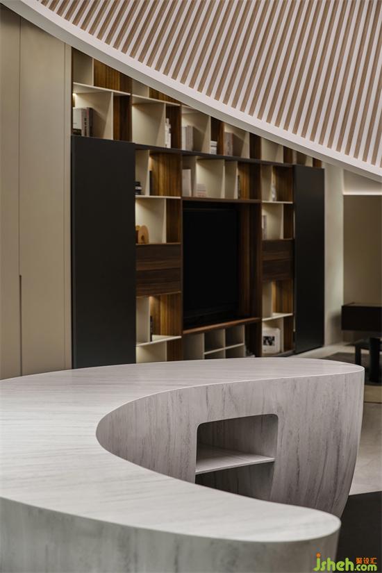 弧形的島臺,盡顯曲線之美,既可以作為游覽過程中的中轉(zhuǎn)站暫歇,又呼應空間中的其他曲線元素,營造靈動柔和的氛圍。