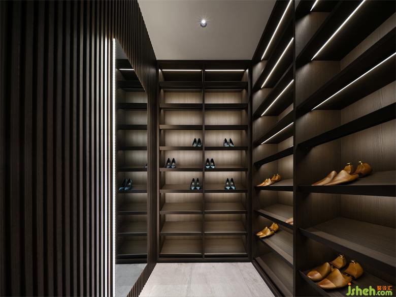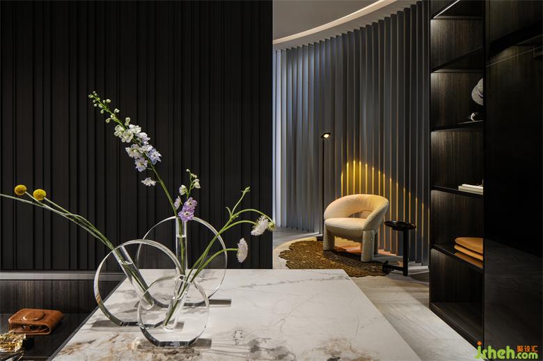 衣帽間在落日燈的斜輝下顯得靜謐而氛圍感十足,簡(jiǎn)約柔和的沙發(fā),中和了洗練線條的硬朗,在豐富的光影里,展廳設(shè)計(jì)空間也被烘托得極具層次感。