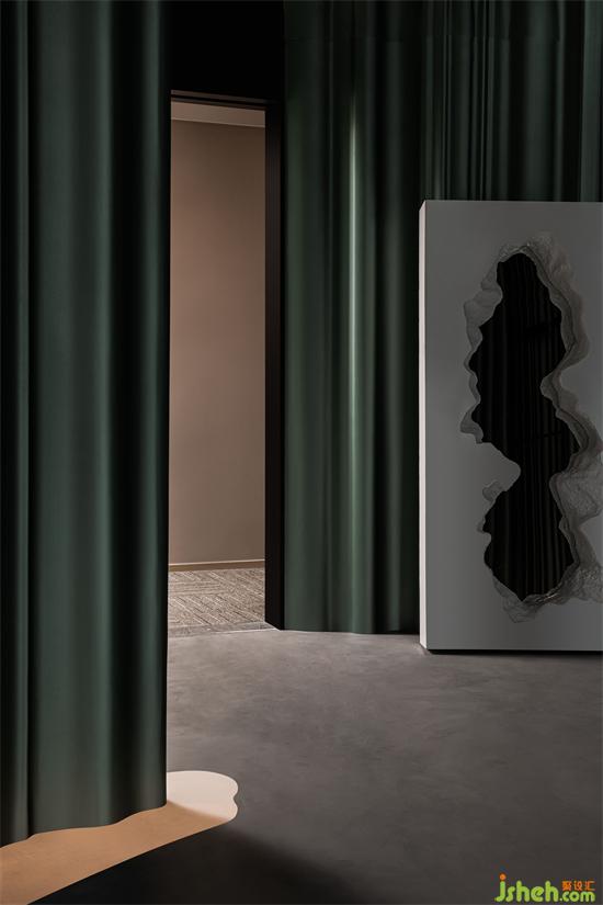 空間選用品牌的基本色墨綠色作為背景基調(diào),如瀑布般傾瀉而下的墨綠色隔墻,辦公室設(shè)計以絲綢漆模仿真絲內(nèi)衣質(zhì)感,拉開了空間的戲劇帷幕,垂墜下綠色華美流光,在地上漾起星河漣漪,自由無拘,蔓延流轉(zhuǎn)。