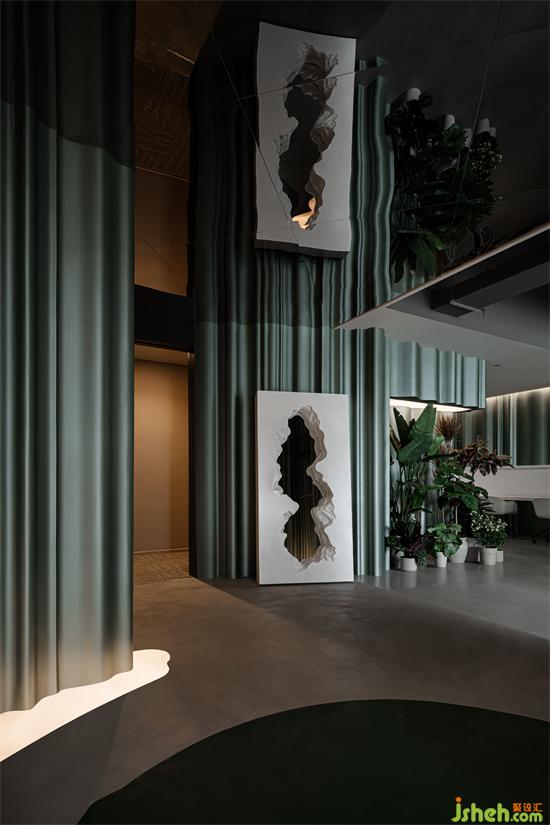 墨綠色調(diào)的暈染,夢幻迷離,為故事的跌宕起伏埋下伏筆。辦公室設(shè)計綠瀑與燈流相映生輝,光明與晦暗交織,彼此堆疊,彼此成就。