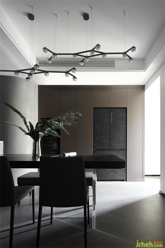 深色的餐桌椅,簡(jiǎn)雅質(zhì)感,增加了用餐時(shí)的儀式感。家裝設(shè)計(jì)枝丫形吊燈利用堅(jiān)韌硬朗的線條勾勒出空間的脈絡(luò)。