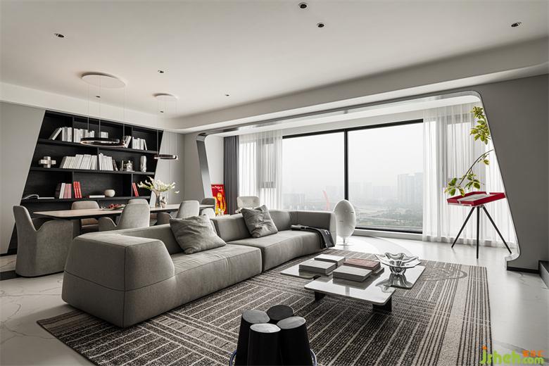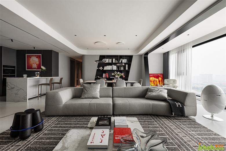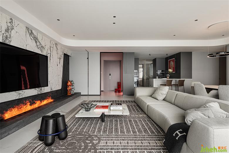 客廳視野開闊,采光極佳,透過落地窗,即可將成都國際城南的繁華景觀盡收眼底??臻g以經(jīng)典的黑白灰色調(diào)作為主色調(diào),利用版畫鮮艷的紅色作為跳色,沉穩(wěn)質(zhì)感之中,又不乏熱情活力。