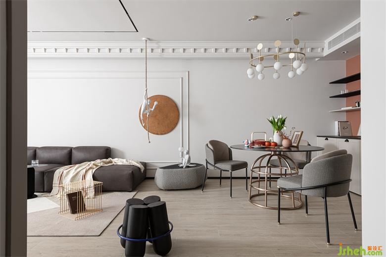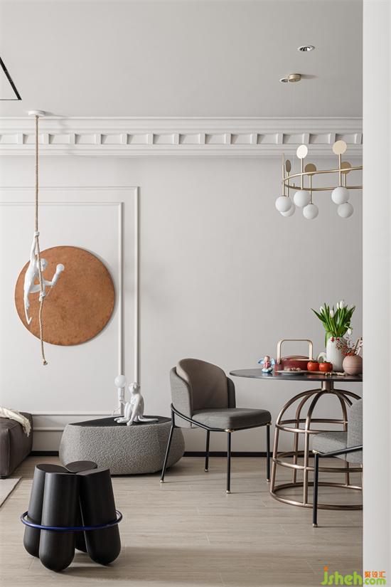 空間擅用圓形與弧形元素,墻壁上的圓形掛件,餐廳的吊燈,餐桌的支撐,以及餐椅沙發(fā)的邊緣,都是圓形或者有著一定的弧度,突顯出整個(gè)空間的溫潤(rùn)與柔和。