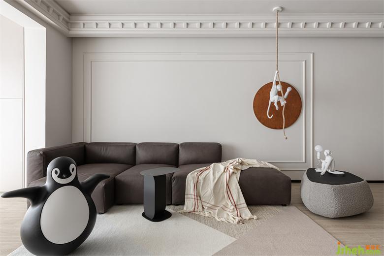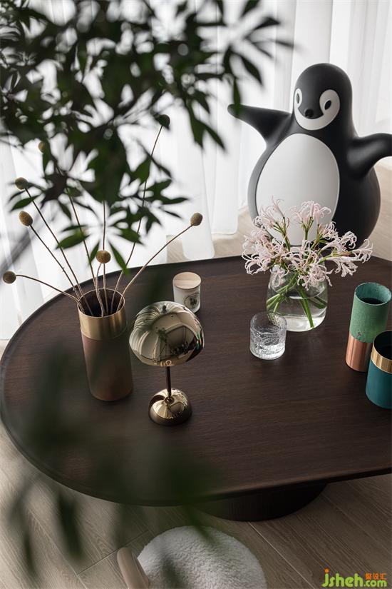 俏皮的企鵝造型擺件與猴子吊燈增加了空間的趣味性,精心布置的瓶盞花器讓整個(gè)空間在一種自然氣息的氤氳下,顯得更加松弛自在。