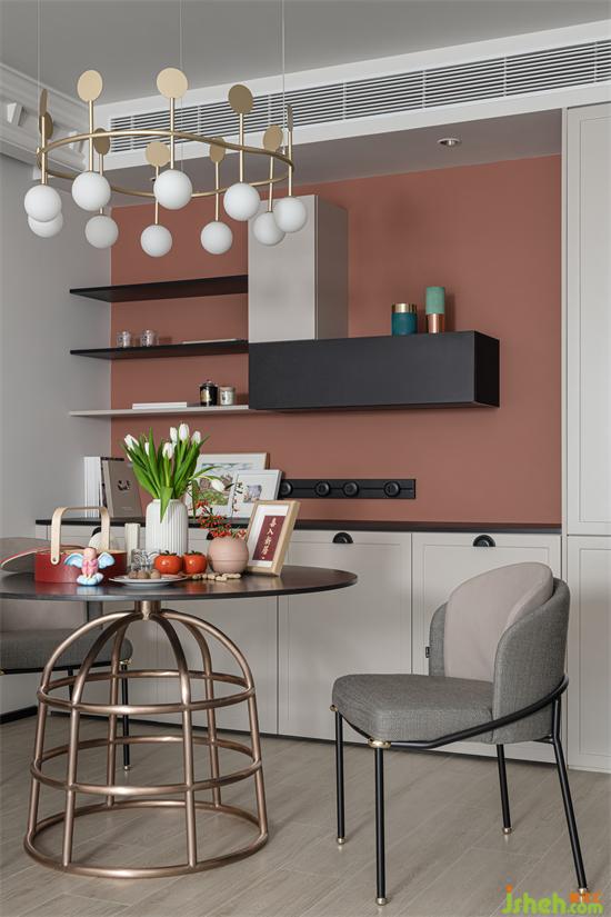 餐廳設(shè)置有多功能餐邊柜,可以進(jìn)行便利收納。背景墻染成與客廳呼應(yīng)的橙色調(diào),讓整個(gè)空間更加明亮。