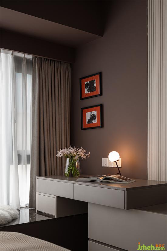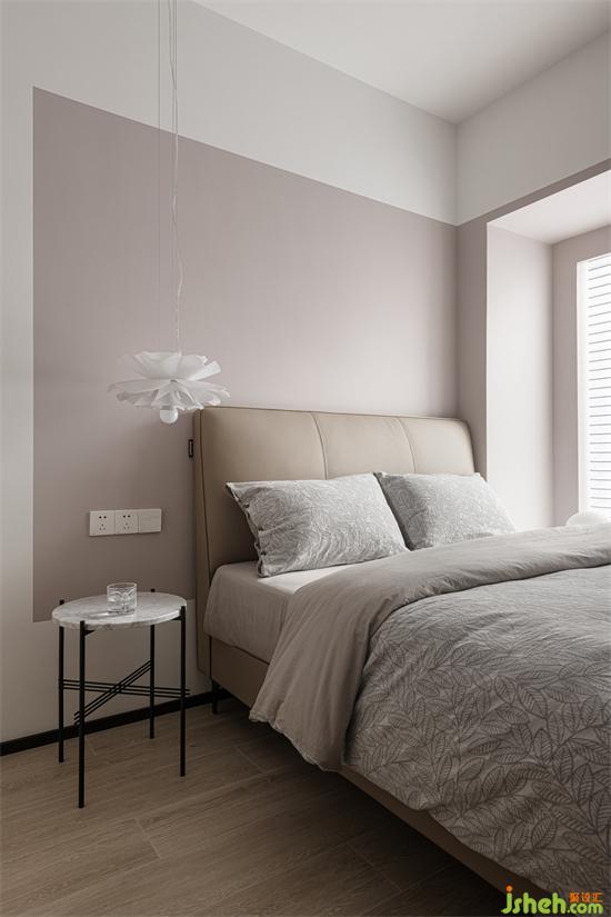次臥利用霧霾紫的墻面,渲染寧靜的安睡氛圍。床頭選用皮質(zhì)軟包,保證了休息時的舒適感。家裝設(shè)計采用纖細(xì)設(shè)計的簡約邊幾,在有限的空間內(nèi)避免了空間在視覺上帶給人的逼仄感。