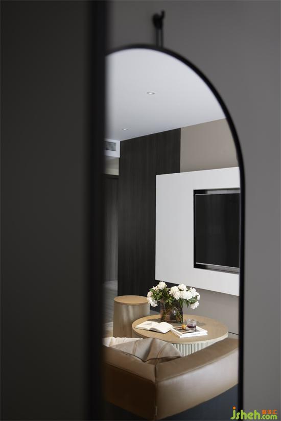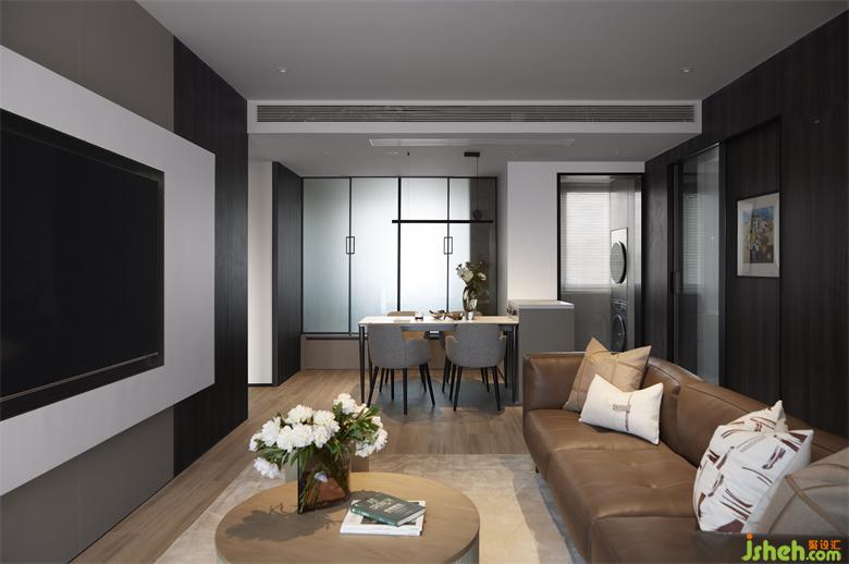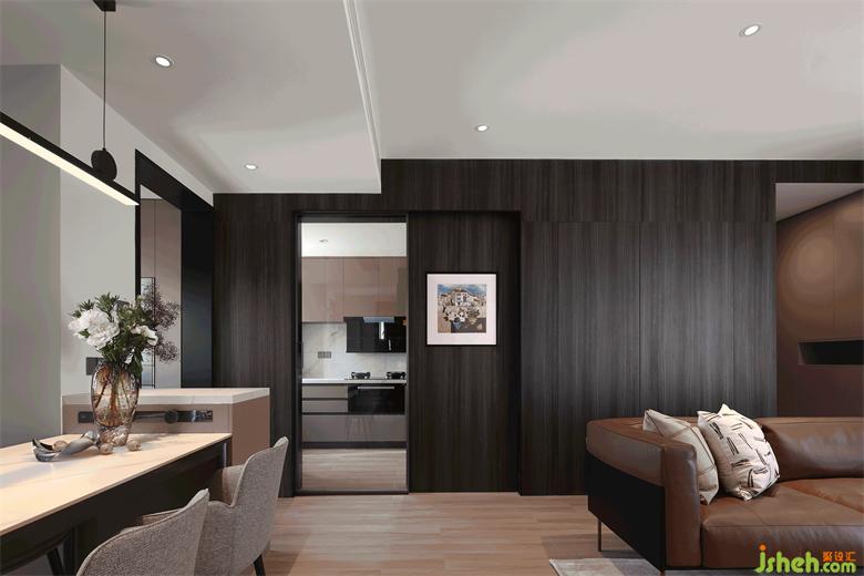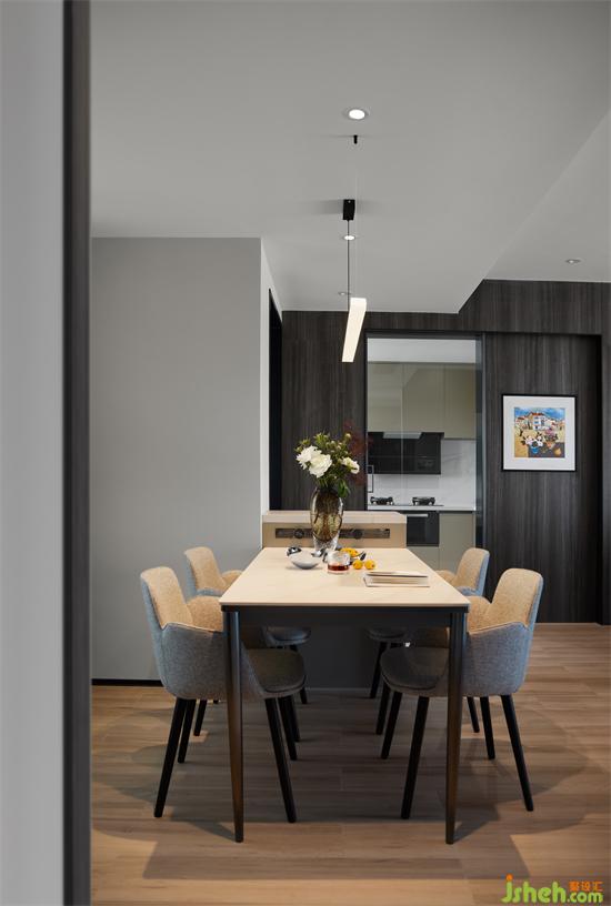 餐廳與客衛(wèi)之間設有隱形門,關閉不用時,展示出整面完整的墻面,成都新綠季節(jié)家裝設計讓整個空間看起來更加和諧統(tǒng)一。