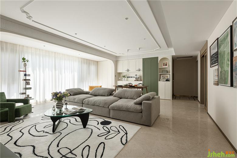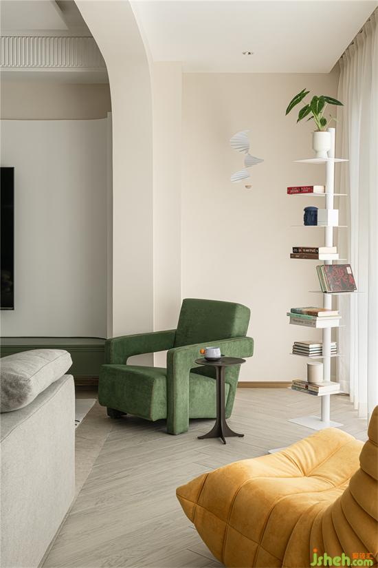 溫軟舒適的灰色沙發(fā)承載著日常的休閑活動。綠色沙發(fā)單椅的跳色,為空間增添了一抹富于希望的亮色,使得整個空間更加自然清新。