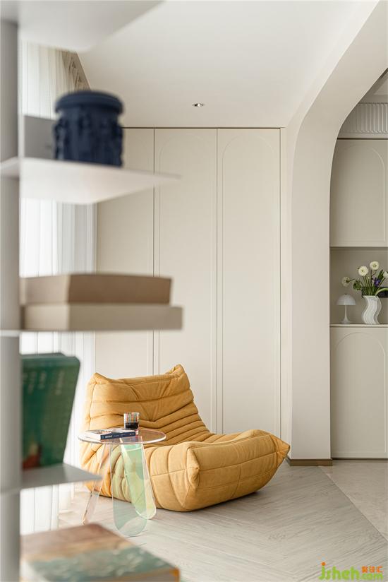 陽臺處的采光充裕,溫雅的白色紗簾,輕盈飄逸,溫婉動人。慵懶自在地窩在懶人沙發(fā),沖上一杯喜愛的飲品,隨手取一本書架上的書,就能度過一整個閑暇愜意的午后。