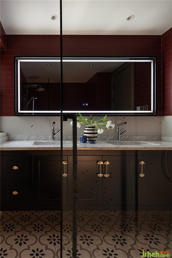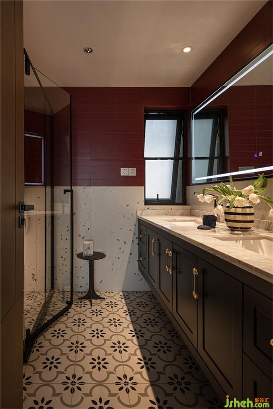 設(shè)計(jì)師將主衛(wèi)進(jìn)行了重新的設(shè)計(jì)改造,顏色選用大膽的復(fù)古紅,奶油小法式家裝設(shè)計(jì)以水磨石元素增加自然質(zhì)樸之感,家裝設(shè)計(jì)以小復(fù)古花磚營造出活潑典雅的格調(diào)。