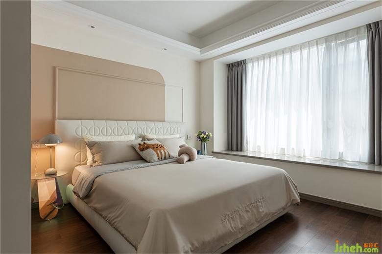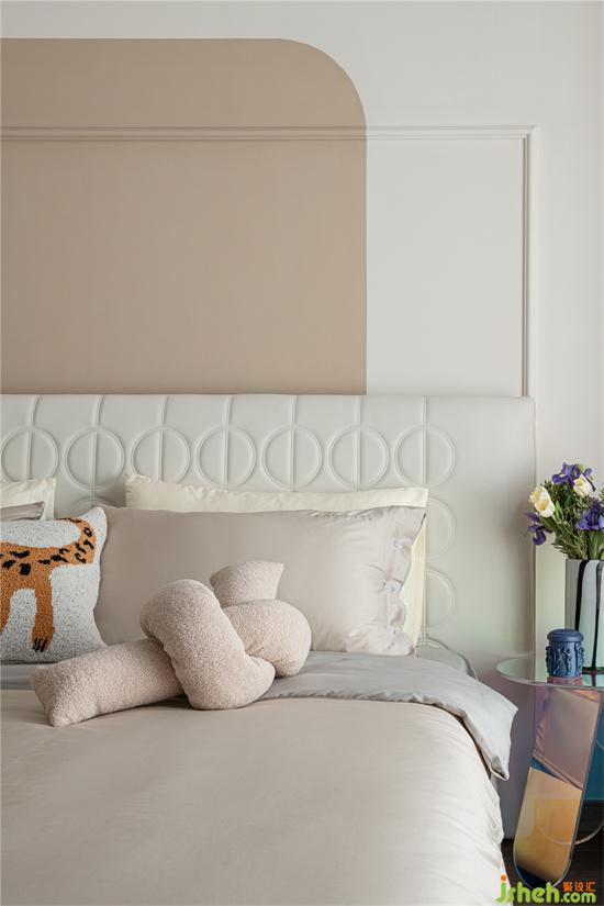 奶油小法式家裝設(shè)計(jì)師將主臥原有裝飾面予以拆除,利用線條與乳膠漆進(jìn)行背景分色。家裝設(shè)計(jì)同時,把衣帽間的門洞改成拱形門洞,邊頂增加石膏線條,精致細(xì)膩,增加儀式感。