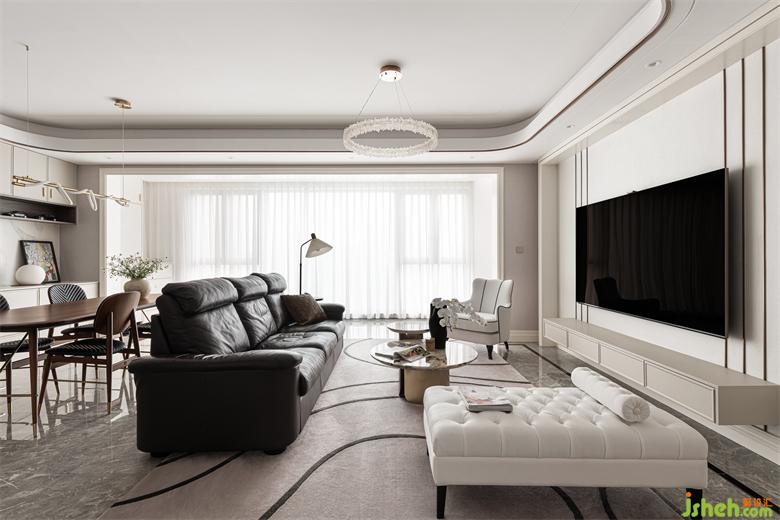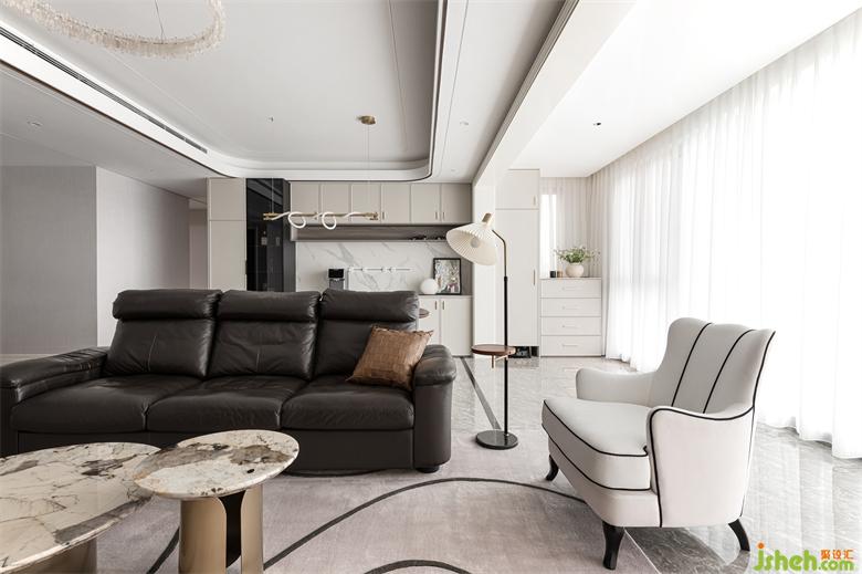深色皮質沙發(fā)坐感舒適,獨具質感,流露出粗獷的自然之美。成都中鐵御花府家裝設計落地燈燈罩的白色傘狀形態(tài)讓整個現(xiàn)代空間別具輕盈靈動之感。地毯上的凝練抽象的藝術線條,富于動感與活力,為空間注入藝術情調的同時,在視覺上形成一種縱深的擴展效果,使空間層次更為豐富。