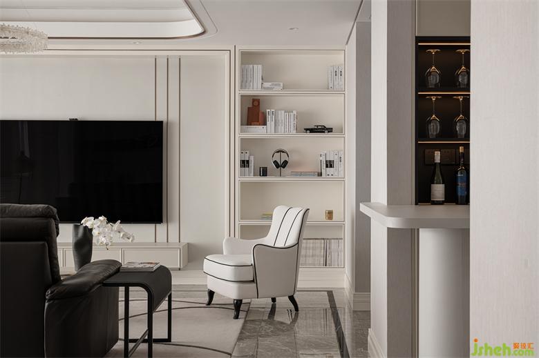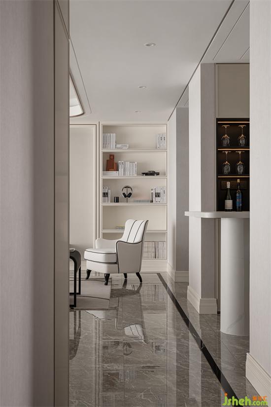 設(shè)計師在空間中設(shè)置了一個專門的小型水吧臺,對空間功能進行拓展的同時,成都中鐵御花府家裝設(shè)計讓整個空間看上去更富于層次。水吧臺延續(xù)空間的白色主調(diào),清新雅觀,開辟出一處理想的互動休閑空間。這里既可以作為用餐區(qū)、娛樂區(qū),還可以作為工作區(qū),供家庭成員在輕松的環(huán)境中完成家庭辦公或?qū)W習(xí)任務(wù)。