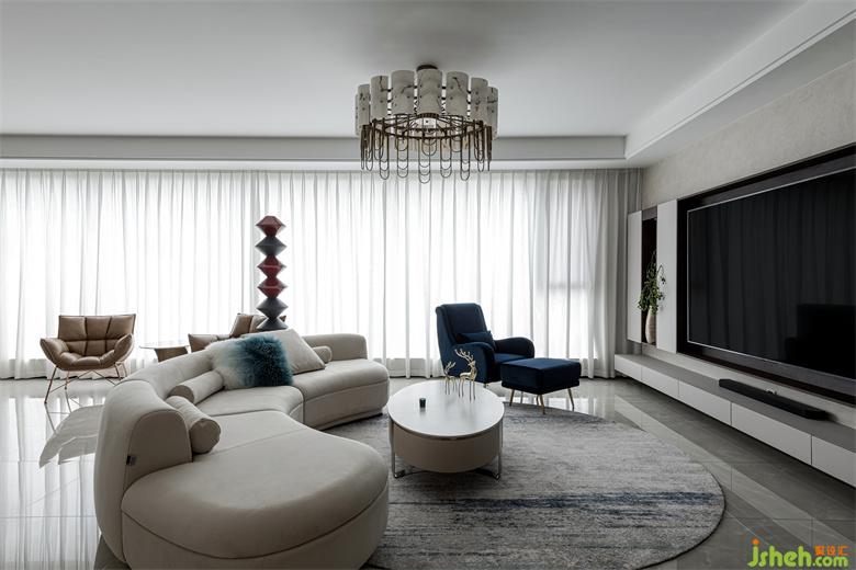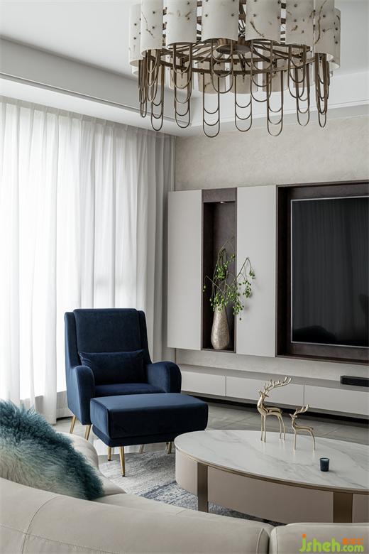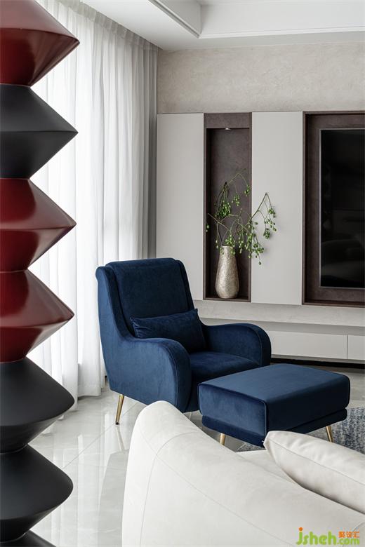 樹立在客廳的立體幾何雕塑給空間平添些許藝術(shù)氣息,與整個室內(nèi)環(huán)境形成一種和諧共生之美。藍(lán)色暈染的抱枕與沙發(fā)椅、地毯的色彩相呼應(yīng),為整個空間注入一些亮色,散發(fā)出精雅獨(dú)特的浪漫意趣。