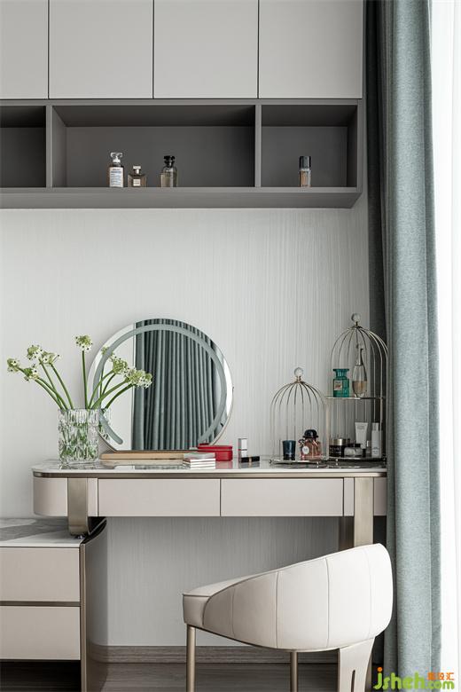 梳妝臺(tái)設(shè)計(jì)簡約,家裝設(shè)計(jì)以柔雅的白色調(diào)為主,桌椅的金屬元素,流露出輕奢質(zhì)感。充足的收納滿足化妝品的合理放置。清芬綠植的點(diǎn)綴,讓空間顯得生氣盎然。