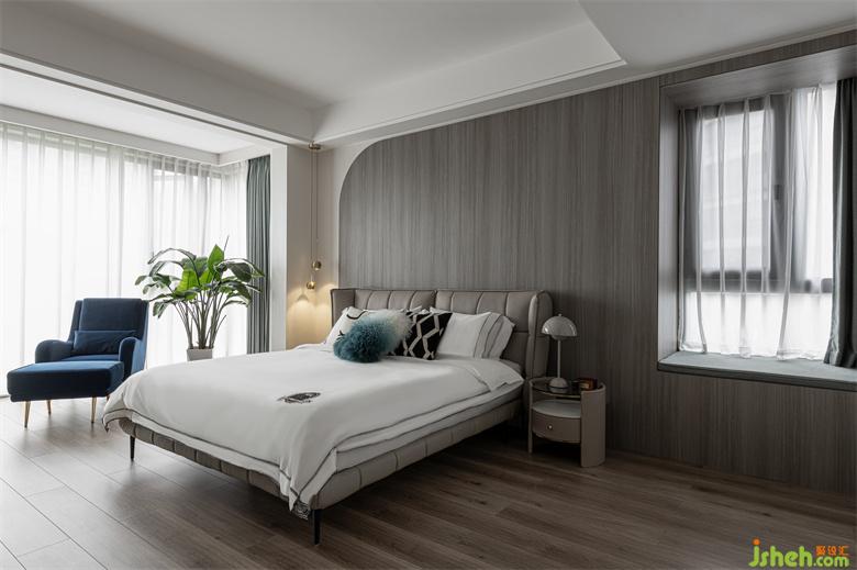 主臥空間明亮開敞,讓人步入其中即有一種視覺上的放松感。主臥的背景墻采用木質(zhì)弧形設(shè)計(jì),紋理細(xì)膩,頗具質(zhì)感。