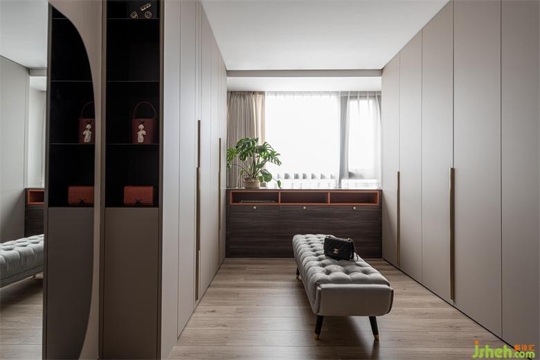 衣帽間遵循著極簡設(shè)計(jì)原則,家裝設(shè)計(jì)將收納利用到極致,整潔有序,金色的把手點(diǎn)綴既呼應(yīng)了空間的輕奢調(diào)性,又極具美觀性。