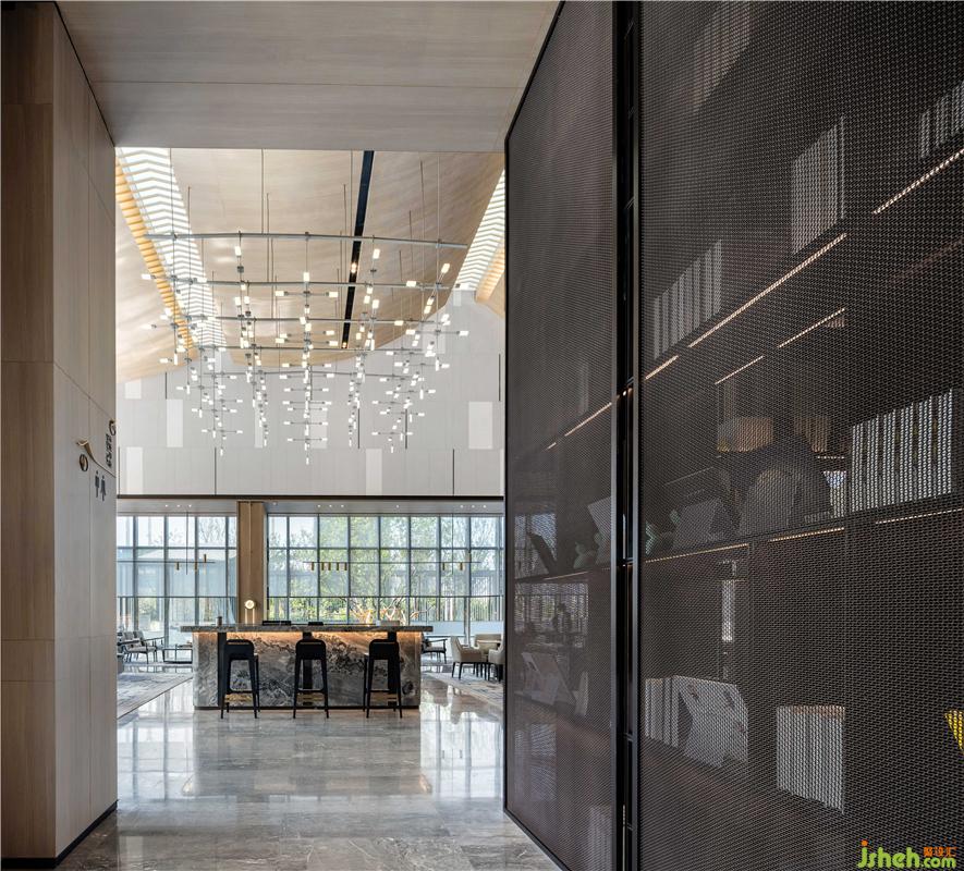 為呈現(xiàn)更開(kāi)闊的景觀視野,將室外風(fēng)景引入室內(nèi),選用玻璃幕墻做為室內(nèi)與室外的連接載體,在設(shè)計(jì)落地的過(guò)程中,其尺寸及形式亦經(jīng)過(guò)多次反復(fù)論證方才最終成型。