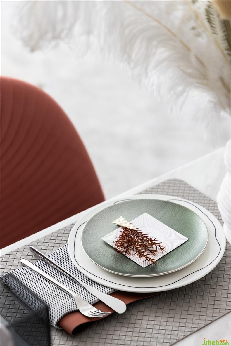 餐廳一抹溫暖的楓葉紅,營(yíng)造溫馨舒服氛圍,宛如行走在秋天的森林中,樣板房設(shè)計(jì)又如三五親朋好友把酒言歡時(shí),臉上微醺泛紅的快樂。