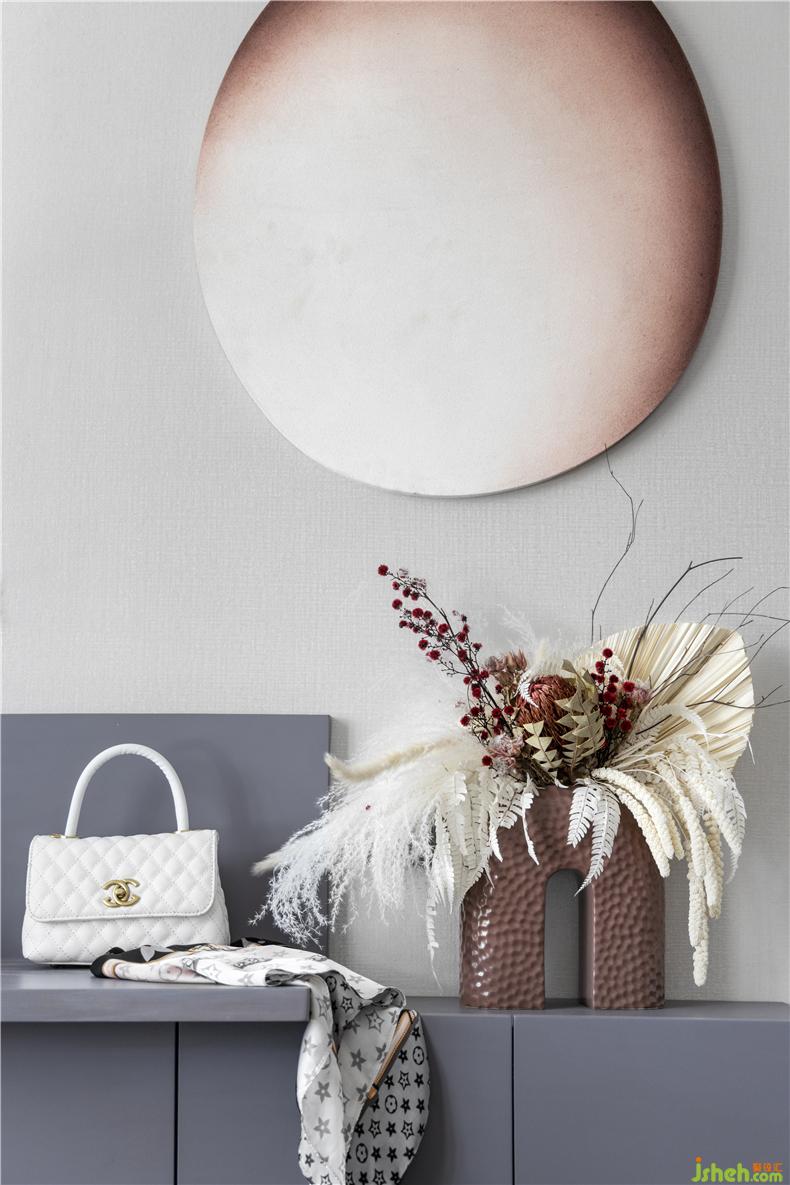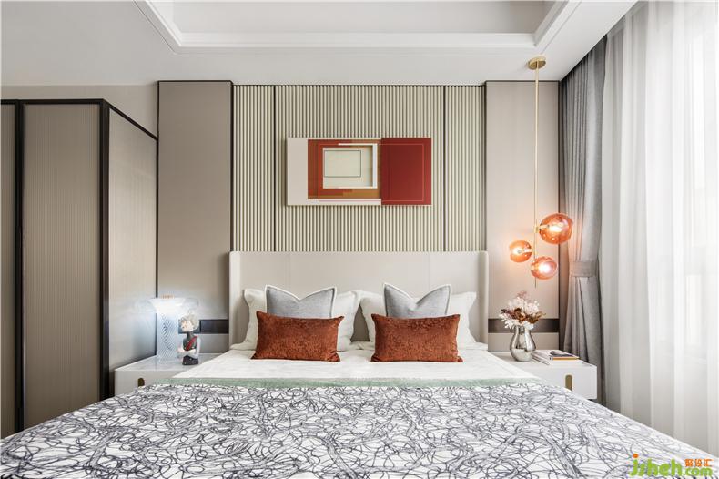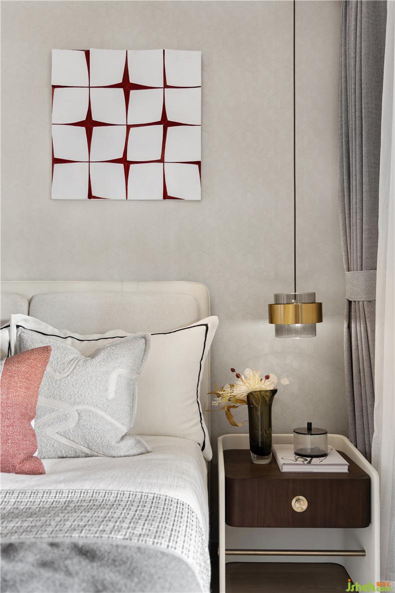 主臥運(yùn)用莫蘭迪色系進(jìn)行區(qū)域劃分,不爭(zhēng)不搶、不濃重、不妖嬈,高級(jí)又低調(diào)。梳妝臺(tái)墻面上升起滿月,仿佛在訴說著夜晚的浪漫。主臥不同材質(zhì)飾品與整個(gè)空間相得益彰樣板房設(shè)計(jì)。