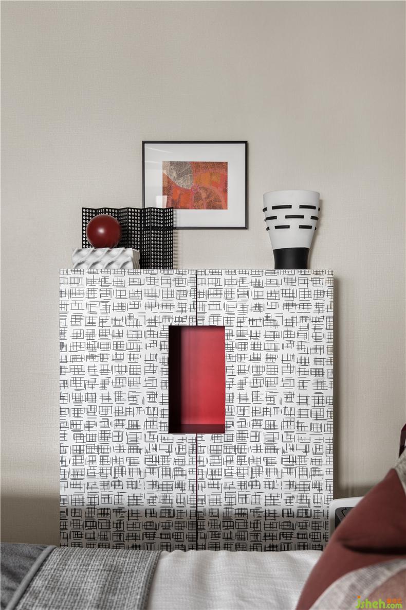 次臥斗柜如一幅抽象畫,又如一件藝術(shù)品,兼具收納又將生活美學(xué)表現(xiàn)得淋漓盡致。樣板房設(shè)計(jì)次臥背景墻面立體幾何紅白裝置物,與斗柜、織品遙相呼應(yīng),穿梭在時(shí)間與空間的隧道中