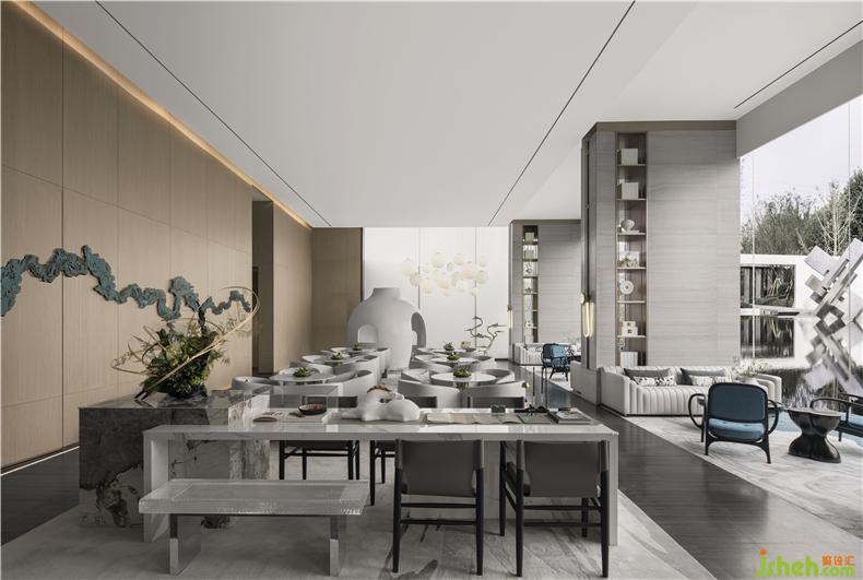 在洽談區(qū),將歸宿感推向極致。全力建造一個(gè)于自然間醉心風(fēng)月、休憩心靈的歸隱之處,倡導(dǎo)平和優(yōu)雅、蘊(yùn)含慰藉的詩(shī)意生活。色調(diào)延續(xù)灰白色調(diào)為主之外,局部點(diǎn)綴的孔雀藍(lán)色和晚霞色,讓用戶重拾夕陽(yáng)下靜止的樹(shù)枝、淡雅的花朵和呼吸的葉脈的感受;材質(zhì)延續(xù)以木質(zhì)、大理石和布藝為主,這是中華兒女居家空間中最為熟悉的材質(zhì),連結(jié)用戶歸宿的情感共鳴。