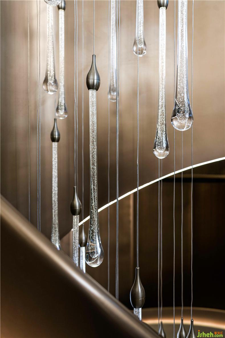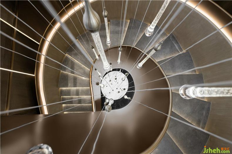 線在物理世界是以邊界的形式存在的,而感官世界里線是一種尺度的認(rèn)知,它的意義不來(lái)自于自身,而來(lái)自如何被形容。沿著墻、循著光,按著動(dòng)線進(jìn)入樓梯拾級(jí)而上金色綢緞自然回旋的樓梯,室內(nèi)設(shè)計(jì)師可靜觀可動(dòng)賞,錯(cuò)落式的燈光裝置如雨幕降落,底部鏡面裝置反射燈光出如夢(mèng)如幻的,俯瞰光影舞動(dòng)。