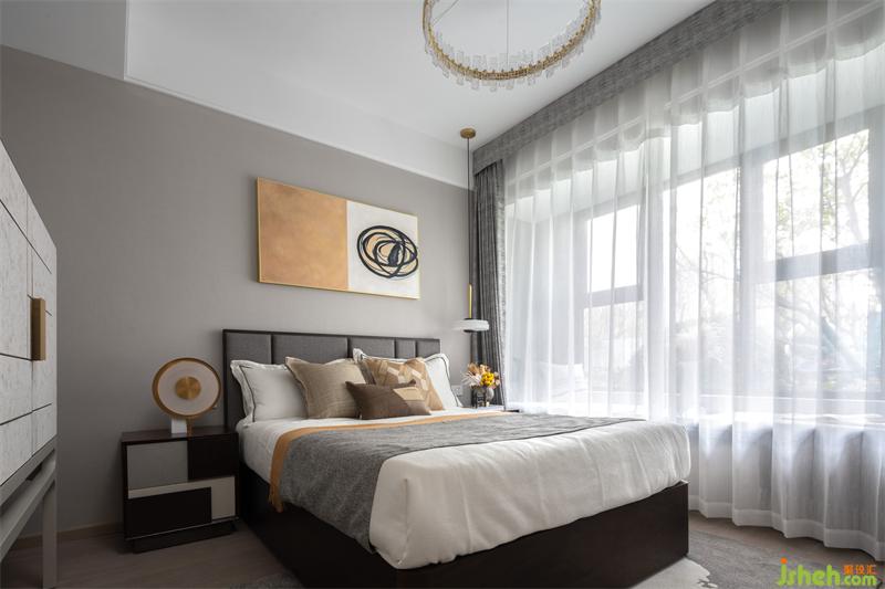 次臥簡潔寬敞,暖色床品打破線條的單調(diào)感,增加溫馨的氛圍。