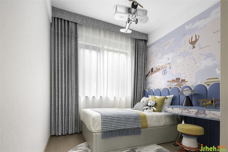 兒童房以“飛行夢想”為主題,墻面、書桌的飛機模型質(zhì)感十足。