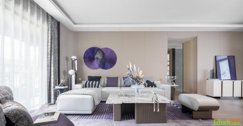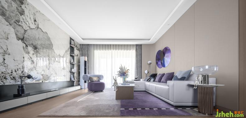 客廳與餐廳的界限被模糊,令家居生活的中心區(qū)域更加集中。樣板房設(shè)計(jì)木質(zhì)與大理石是純粹理性的代表,在之中融入神秘的圣羅蘭紫,是居住者在理性思維下的感性表達(dá)。