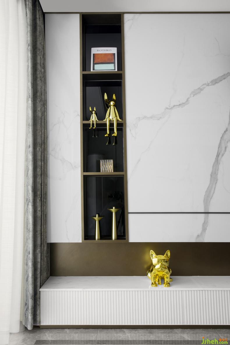 寥寥幾件金屬擺件,就能讓空間色彩對比更加鮮明。亦能從側面表現(xiàn)業(yè)主年輕而活潑的審美。樣板房設計