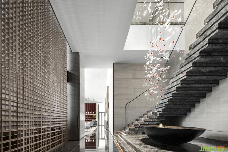 牡丹雕花墜飾和古銅金屬的水池裝置,凝聚著清雅朦朧的東方神韻。裝修設(shè)計(jì)雕花墜飾的透光工藝,使臨居深色水面上的牡丹看似更栩栩如生,吸引來(lái)往的人們對(duì)閑適自得的生活充滿(mǎn)遐想。