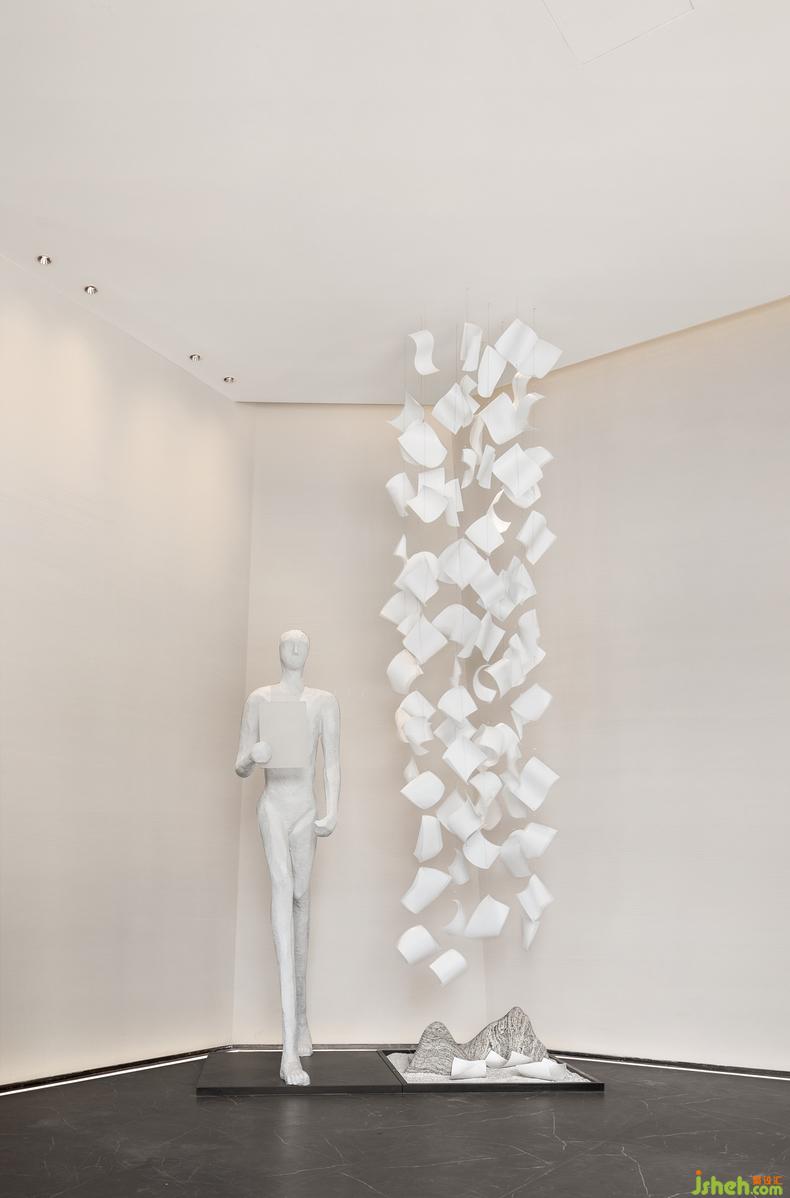 前廳的閱讀主題藝術(shù)裝置以純粹的白色搭配懸浮造型,南寧售樓處設(shè)計以「飛行的書本」 般的空間剪影為器,與簡約、靜謐的入口形成統(tǒng)一語匯,傳達著在空間游走者對于探索城市的無限遐想