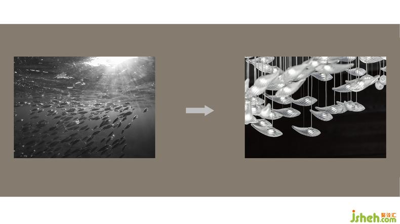 “羈鳥(niǎo)戀舊林,池魚(yú)思故淵”。攜“魚(yú)歸故里”這一概念為出發(fā)點(diǎn),把魚(yú)群的形態(tài)用藝術(shù)化的形式結(jié)合到空間中。