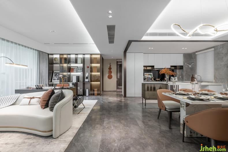 空間整體以灰白色調(diào)為主,以素色為基調(diào),高質(zhì)感的選材加以高級(jí)灰以及灰橙色點(diǎn)綴。