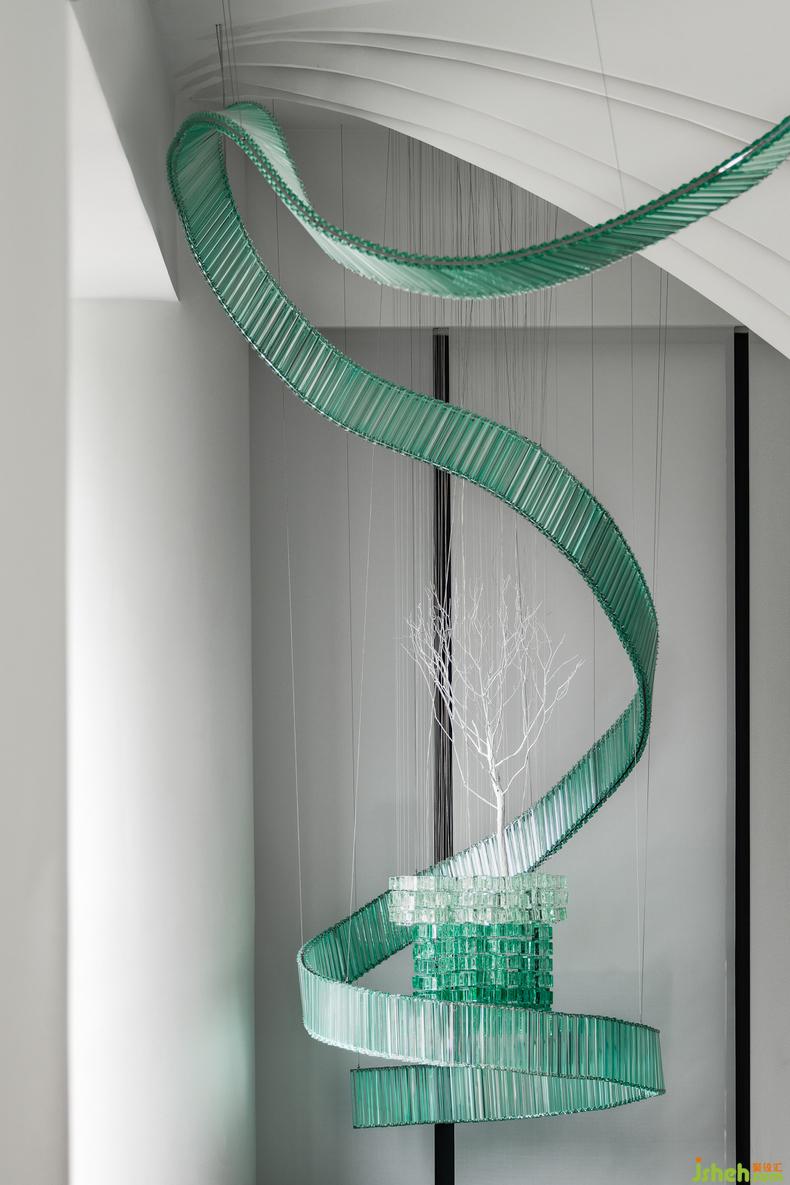 接待前廳是空間的第一印象,從天垂降的藝術(shù)天花裝置以輕盈的形態(tài),貫穿整個(gè)空間,與城市中蜿蜒飄然的柳江相呼應(yīng)。以水為脈,以樹為神,動(dòng)態(tài)回歸到靜物,一株枝葉紛繁的樹立于中心,小小一隅,囊括了自然的靜美與崢嶸。于一水一木中營(yíng)造“寄情于山水之間”的美好生活方式。