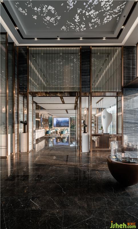 設(shè)計(jì)亮點(diǎn):頂面充滿現(xiàn)代的書頁吊燈,類似硯臺的沙盤結(jié)合。通高的書柜,營造整體書香氛圍。同時和現(xiàn)代樓盤銷售很好的結(jié)合。整個二層的金屬隔斷造型。類似織布的布景,也體現(xiàn)當(dāng)?shù)氐纳PQ文化。