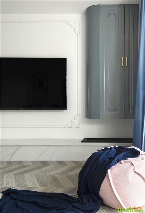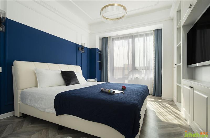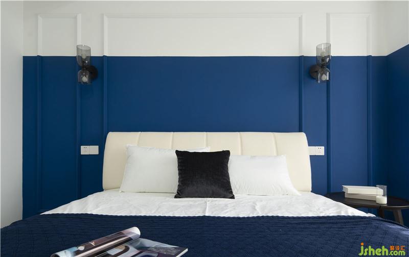 主臥室背景墻上沒有用太多的裝飾,幾根線條和藍(lán)色乳膠漆修飾?;疑AП跓舨粨屟?,但是很低調(diào)的裝飾了墻面。