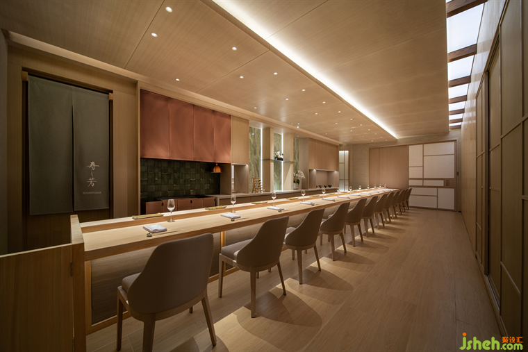 日料餐廳設(shè)計(jì)整個(gè)空間以木元素為主體,座區(qū)背后天花運(yùn)用的“青空燈”模擬自然光。