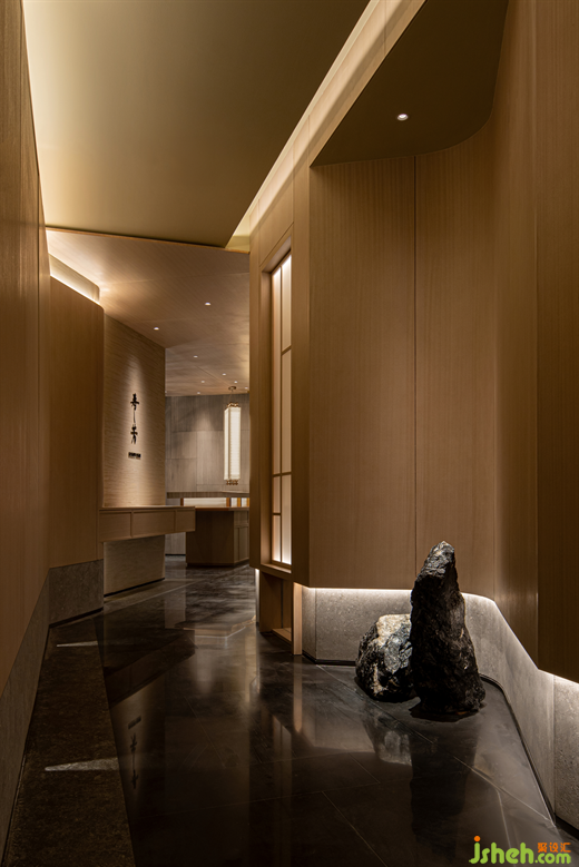 走廊終端,以竹藝、奇石,一方小小造景成為空間中點(diǎn)睛之筆,自然的小徑讓客人在廚師表演的間隙可享受花園體驗(yàn)。在這個(gè)以美食為引、以美學(xué)為心的私密、靜謐、自然與文藝的空間中,美美與共,余韻悠長。