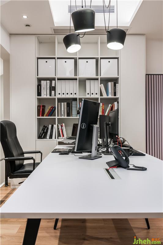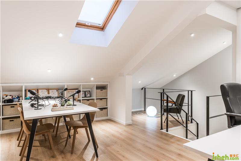 在設(shè)計(jì)辦公區(qū)時(shí)我們就考慮到業(yè)主的特殊職業(yè)需求做了辦公區(qū)的劃分,二樓右側(cè)作為一個(gè)可以容納四個(gè)人的錄音區(qū),利用閣樓邊角的特殊高度,定制了特殊尺寸的收納柜完成這個(gè)區(qū)域的收納。閣樓的無(wú)主燈設(shè)計(jì)充分滿足了明亮的燈光需求,主要辦公區(qū)域的射燈都是色溫一致,沒(méi)有明暗對(duì)比空間感覺(jué)十分明亮舒適。