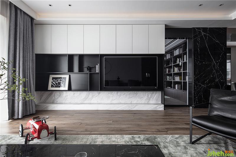 電視背景墻采用石材結(jié)合白色柜體 豎形分隔拉伸空間高度