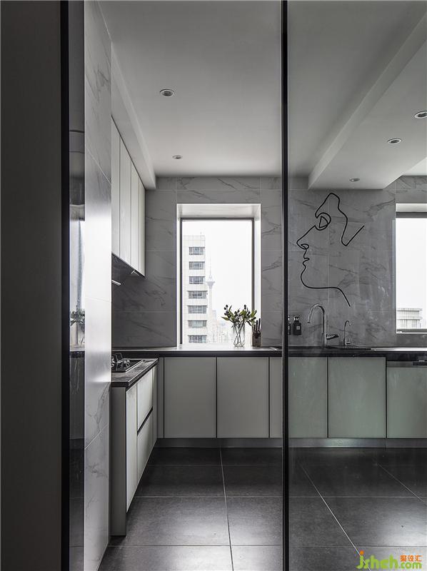 整個空間被全部打開,以灰、白、黑色為主調(diào),墻面和柜體由白色色塊組成,加上纖細的線條,滿足廚房的烹飪需求和收納需求后,又在材質(zhì)上形成統(tǒng)一,洗碗機、蒸烤箱按照尺寸都嵌入櫥柜里,關上門都被隱藏起來,除了玻璃移門,其余墻都做了整墻櫥柜,結合大理石紋理的墻磚,廚房全部的收納都集中在這里,大大增強了空間儲物功能和便利性。男主人因為海外留學多年的經(jīng)歷,擅長烹飪,這里自然成為了他閑暇之余大展身手的地方。