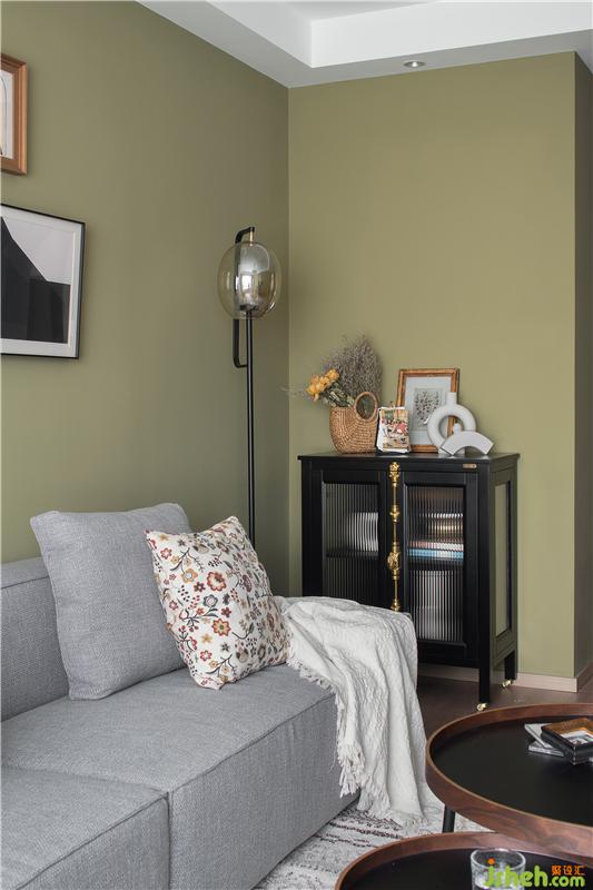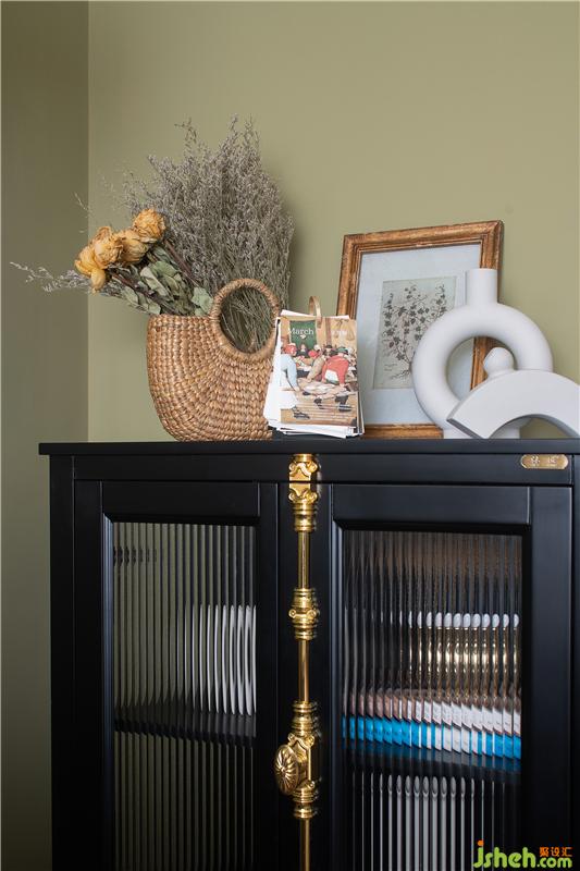 電視背景墻采用大面積的復(fù)古綠同時(shí),也用規(guī)律的豎形線條帶來獨(dú)特的處理。這個(gè)角落,造型優(yōu)美的器皿,活潑的跳色,瞬間點(diǎn)亮整個(gè)空間。