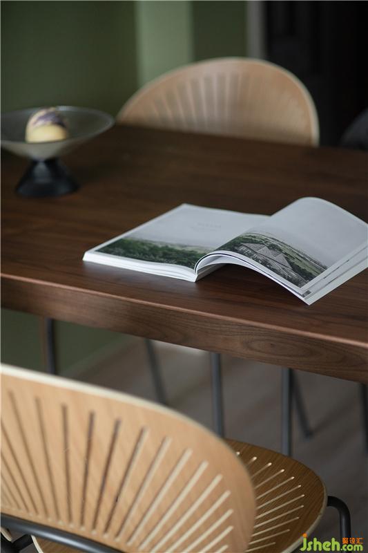 把舊電影的場景搬回家,空間主色調(diào)通過深色實(shí)木地板+復(fù)古綠墻面,帶來懷舊的氣質(zhì)。金色銅質(zhì)把手的邊柜,給這里增添幾分精致。