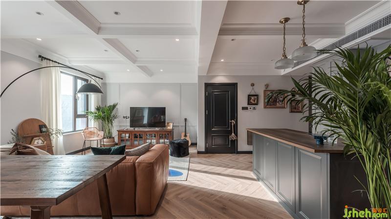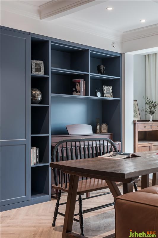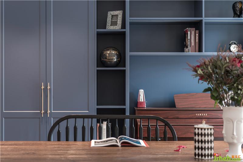 屋主M喜歡復古、輕松的氛圍,一樓空間主色調(diào)通過深棕皮質(zhì)沙發(fā)+復古藍柜面,天津別墅設(shè)計搭配造型復古的精致擺件,深色的木質(zhì)帶來懷舊的氣質(zhì)。屋主一家人在家的時間比較多,希望家可以很溫暖,充滿包容,同時又可以時換時新,不然沒住多久就看膩了。