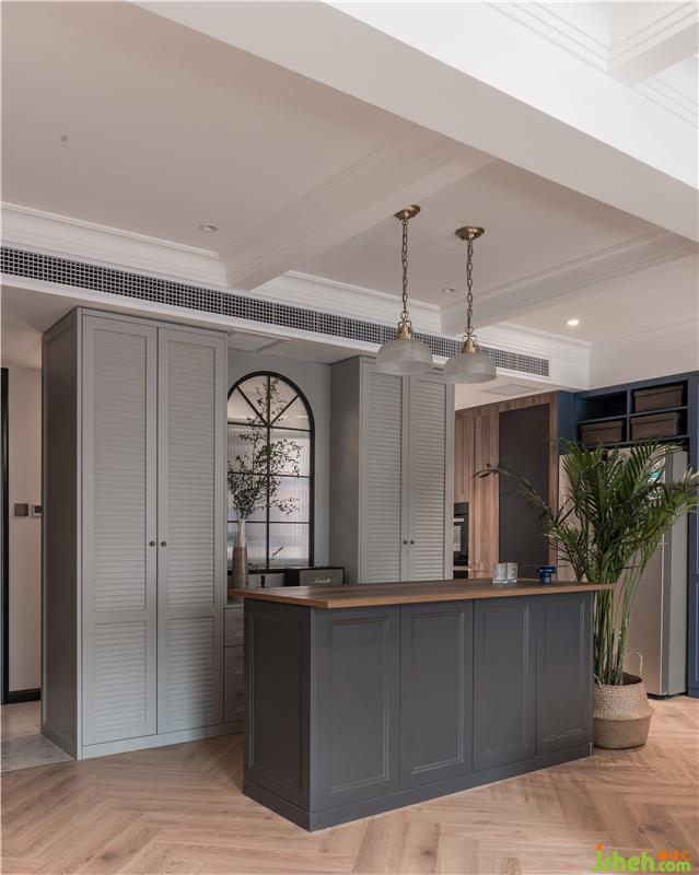 櫥柜的紋理特別選用了這種木質(zhì)紋理,深色紋理搭配純黑臺面,顯得十分高級,搭配清新的小白磚和水磨石地面,廚房顏色有主有次。純黑百葉簾的選擇為空間帶來了協(xié)調(diào)一致的美感。