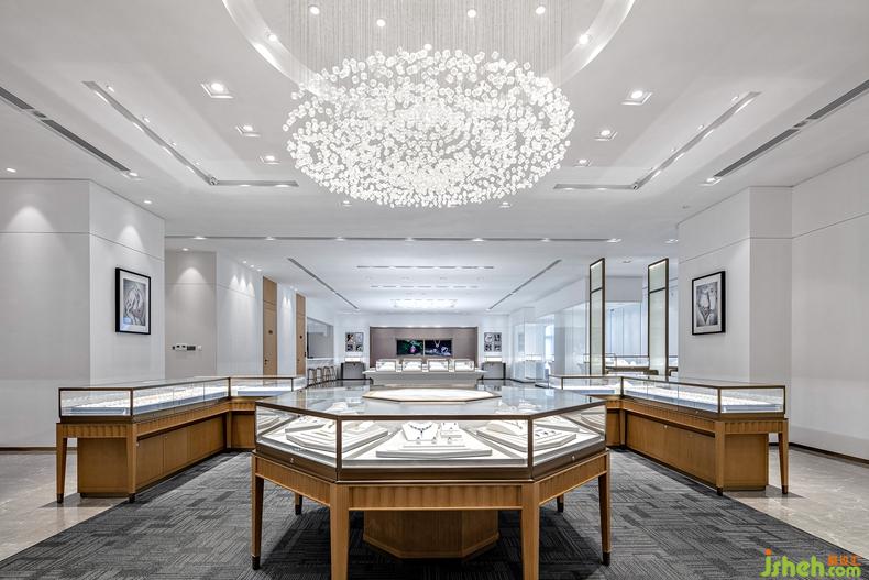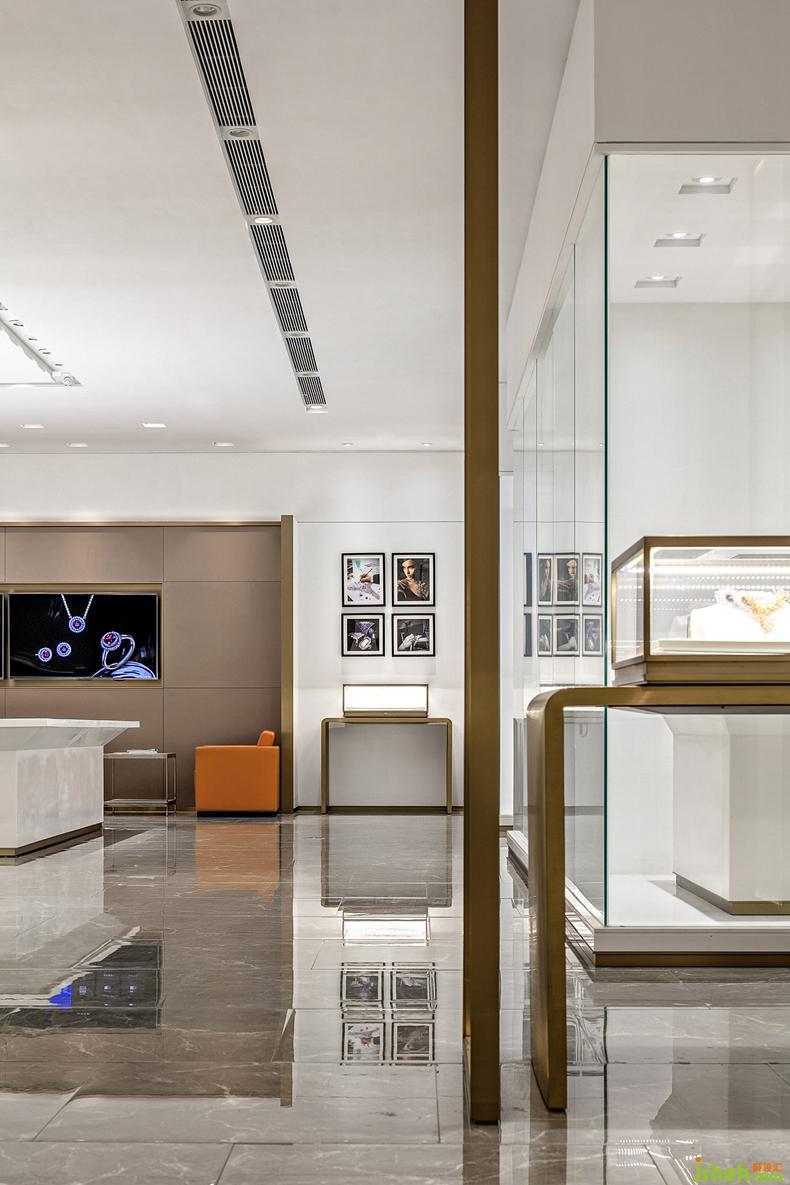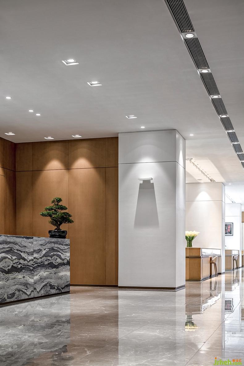 作為珠寶展示區(qū)的入口,接待前廳延續(xù)簡約時尚,低調奢華的設計手法,原木的柔和減弱了石材的硬朗與金屬的冰冷感。